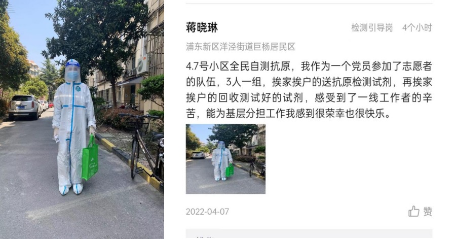 该第三党支部组织兼纪检委员蒋晓琳所居住的小区自3月24日以来,一直实施封控管理。作为财务结算中心会计,居家办公期间,她负责的相关工作不能中断,同时因爱人是社区民警,特殊时期需要在社区一线连续值守,照顾5岁儿子的担子也更多落到了她的身上。尽管面临诸多困难,但作为支部支委她牢记党员身份,第一时间响应所党委号召,向所在社区居委报到,并主动联系报名加入小区志愿者队伍,承担抗疫检测试剂盒的分发与回收工作。“能为基层分担工作我感到很荣幸也很快乐”,她在抗疫日记留下了自己的心声。(上仪所)
