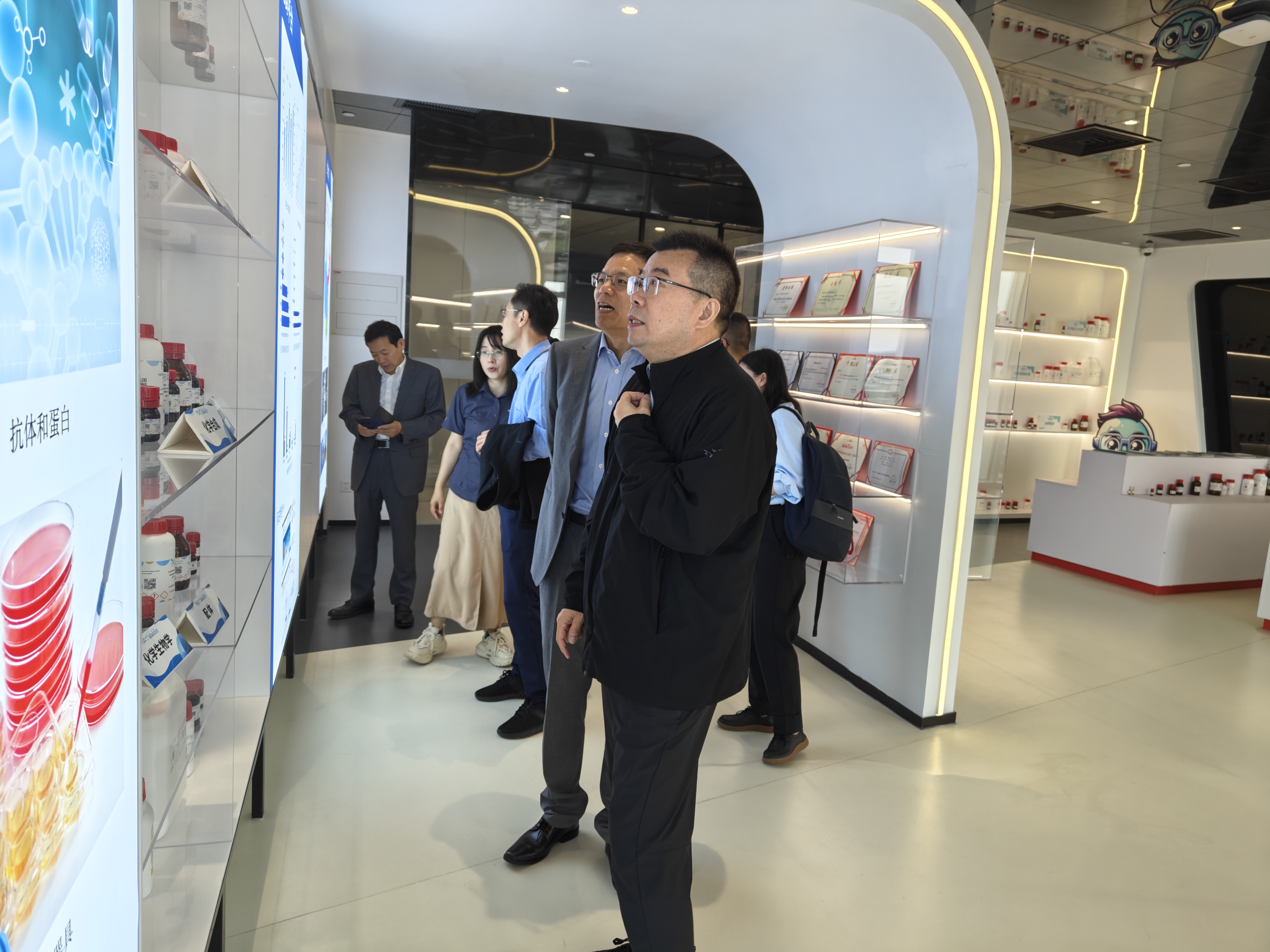 在阿拉丁,孙真荣院长一行参观了公司产品展厅,公司董事长、总经理徐久振及核心团队成员出席接待,介绍了公司的发展历程、竞争优势、产品布局、业务模式、经营现状及质量管理等相关情况,并就科研试剂行业的未来发展趋势进行了座谈交流。